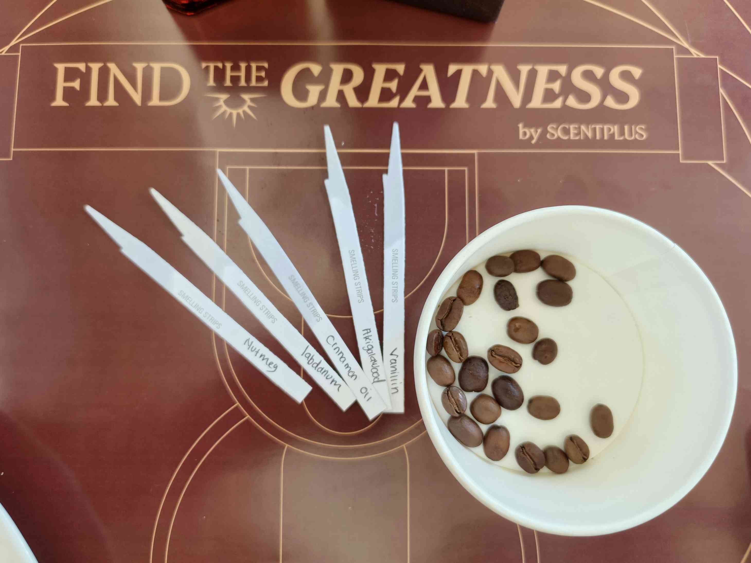 Tepat itu ternyata itu aroma kopi !! ... Kami disedorkan cup berisi biji kopi robusta untuk di smelling. Kemudian lima smelling strip disuguhkan, ada aroma nutmag, vaniliin, cinnamon oil, labdanum, dan akigalawood.